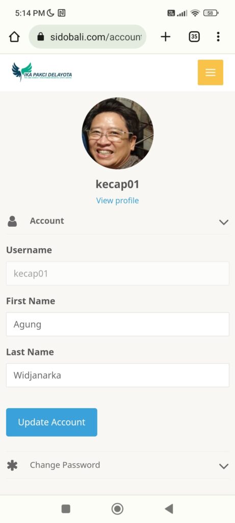 2. Pilih menu Akun maka akan keluar tampilan seperti di samping kanan dan pilih Change Password