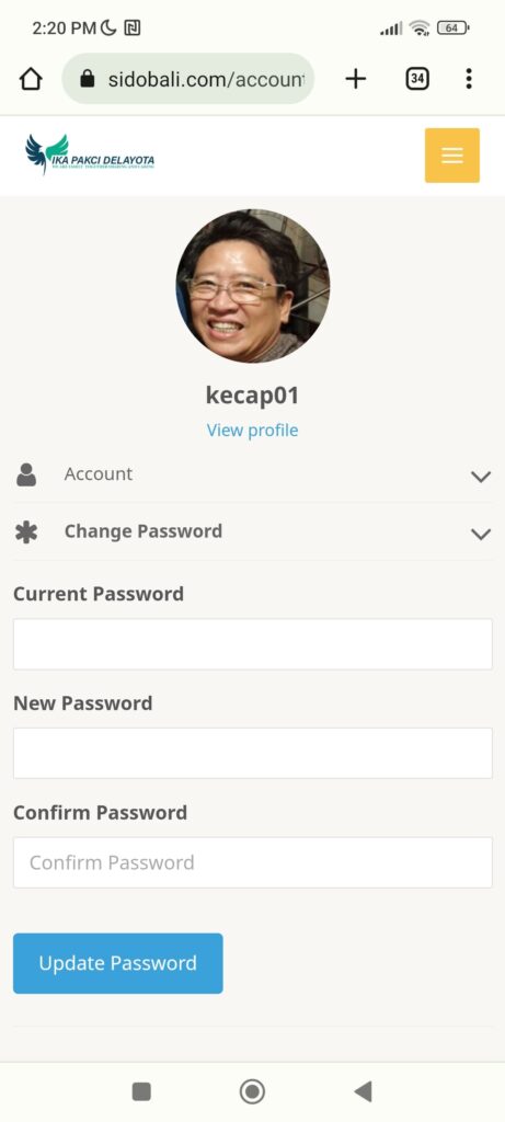 dalam perubahan password maka silahkan konfirmasi ke perwakilan angkatan untuk meminta perubahan password baru dengan mengirimkan data nama panggilan dan email anda dan selanjutnya perwakilan anggkatan akan melakukan konfirmasi ke admin sidobali.com